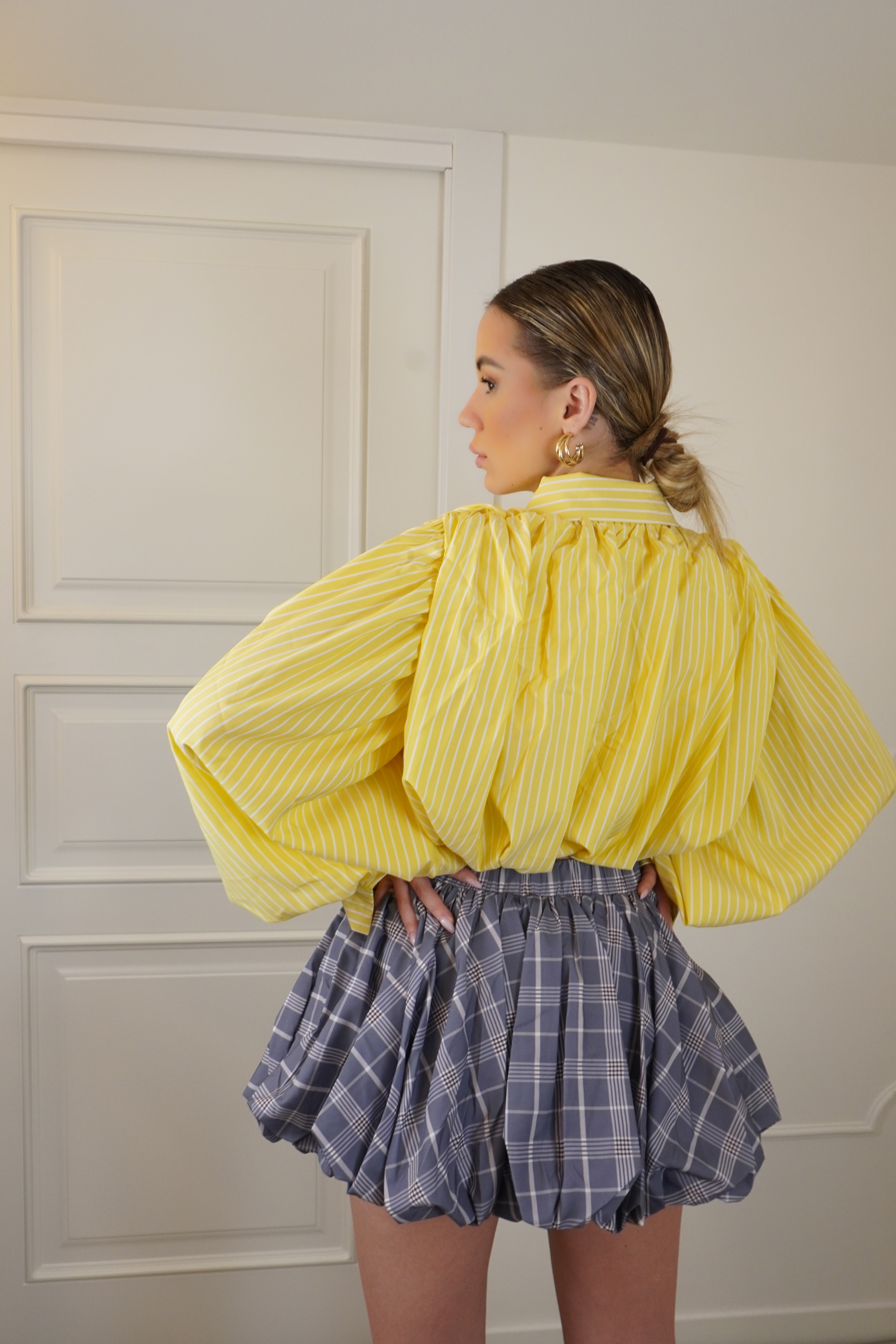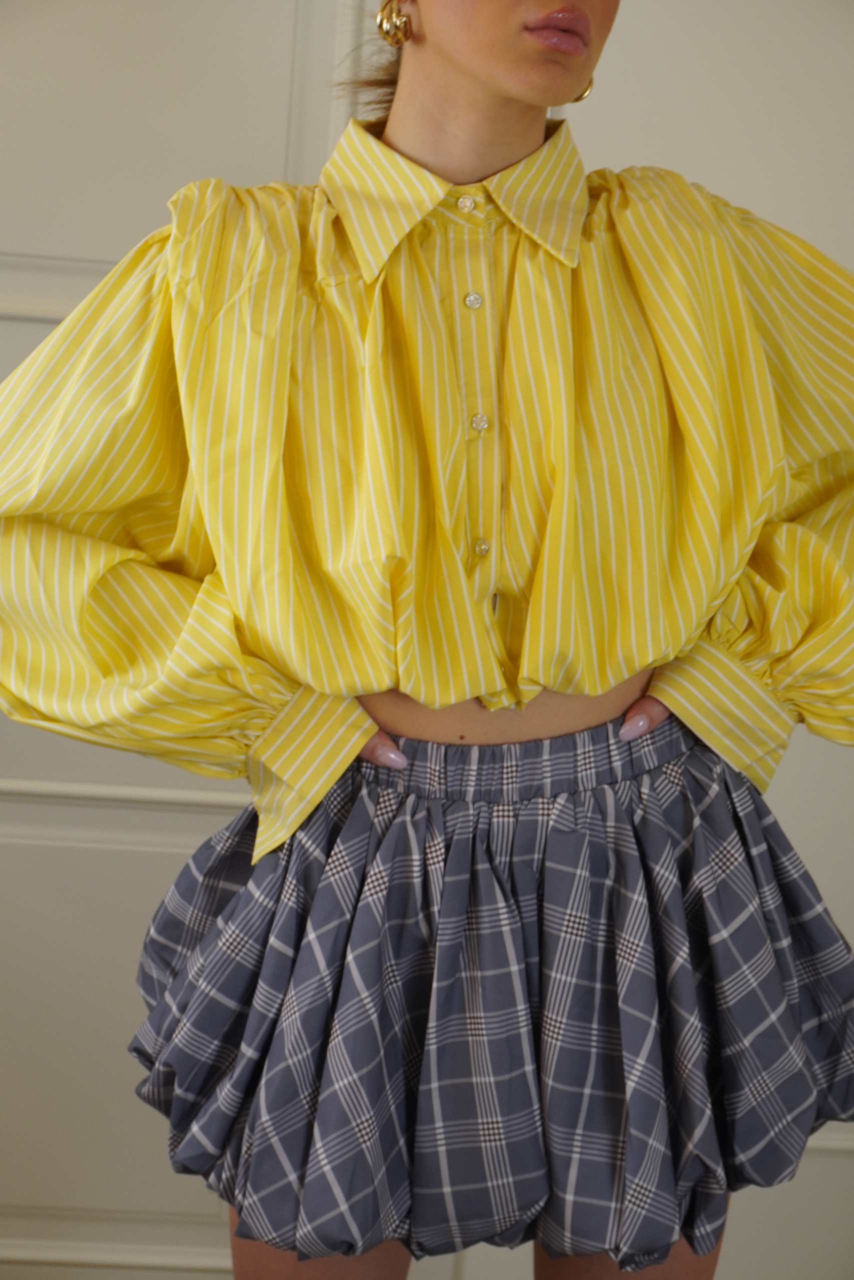 camicia cropped over, colletto classico, chiusura a bottoni gioiello frontali, maniche a palloncino, vestibilitá comoda la modella indossa S/M