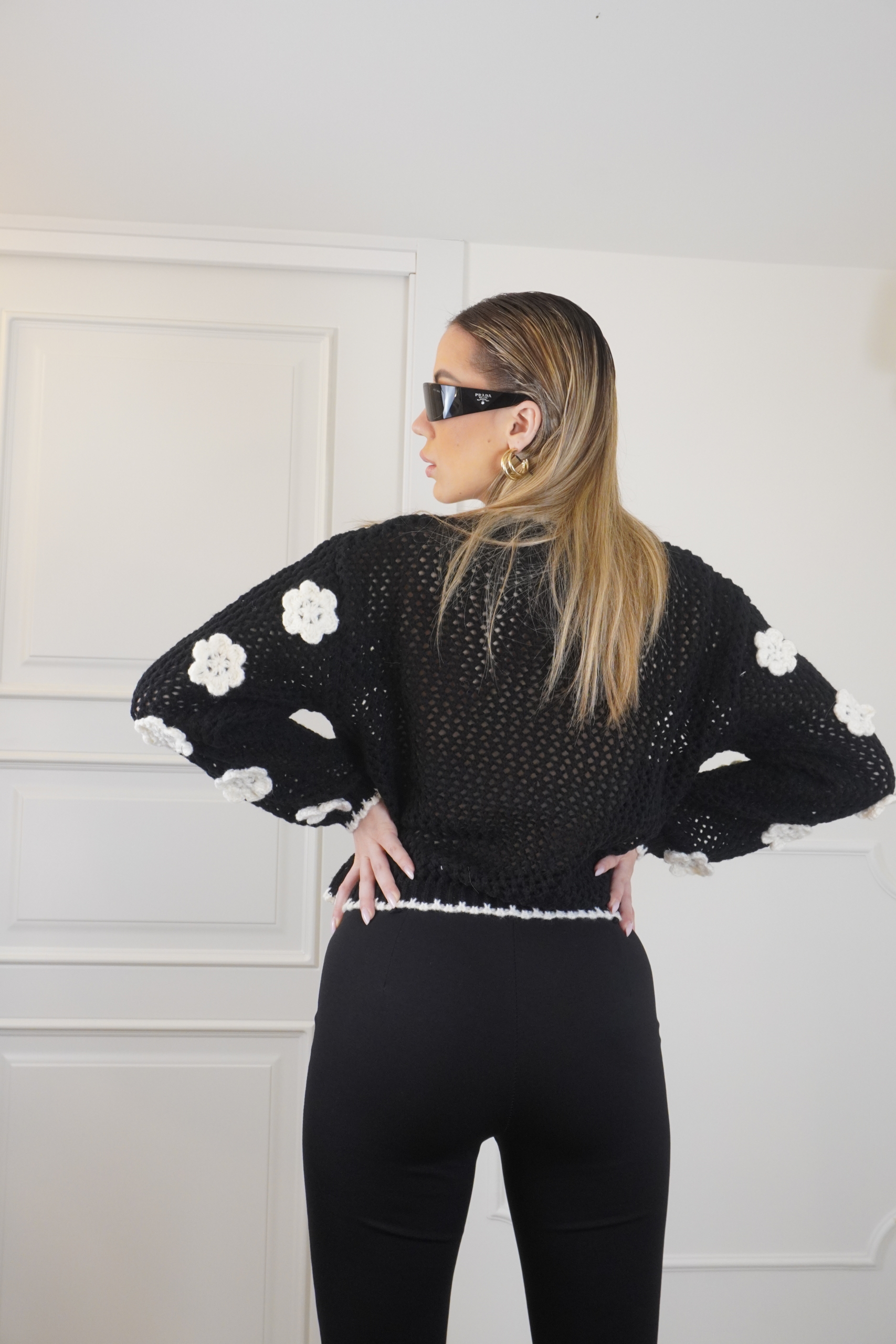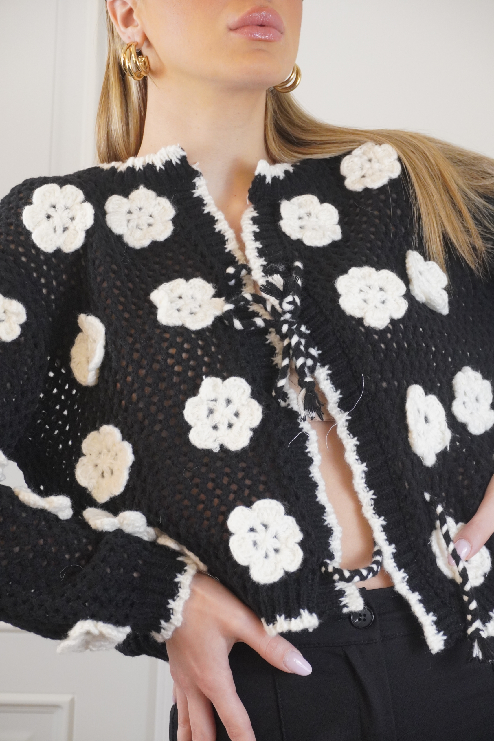 cardigan con chiusura a laccio sul davanti, dettaglio applicazione di rose in rilievo, tessuto traforato ed elasticizzato. Vestibilitá comoda, può vestire fino ad una XL