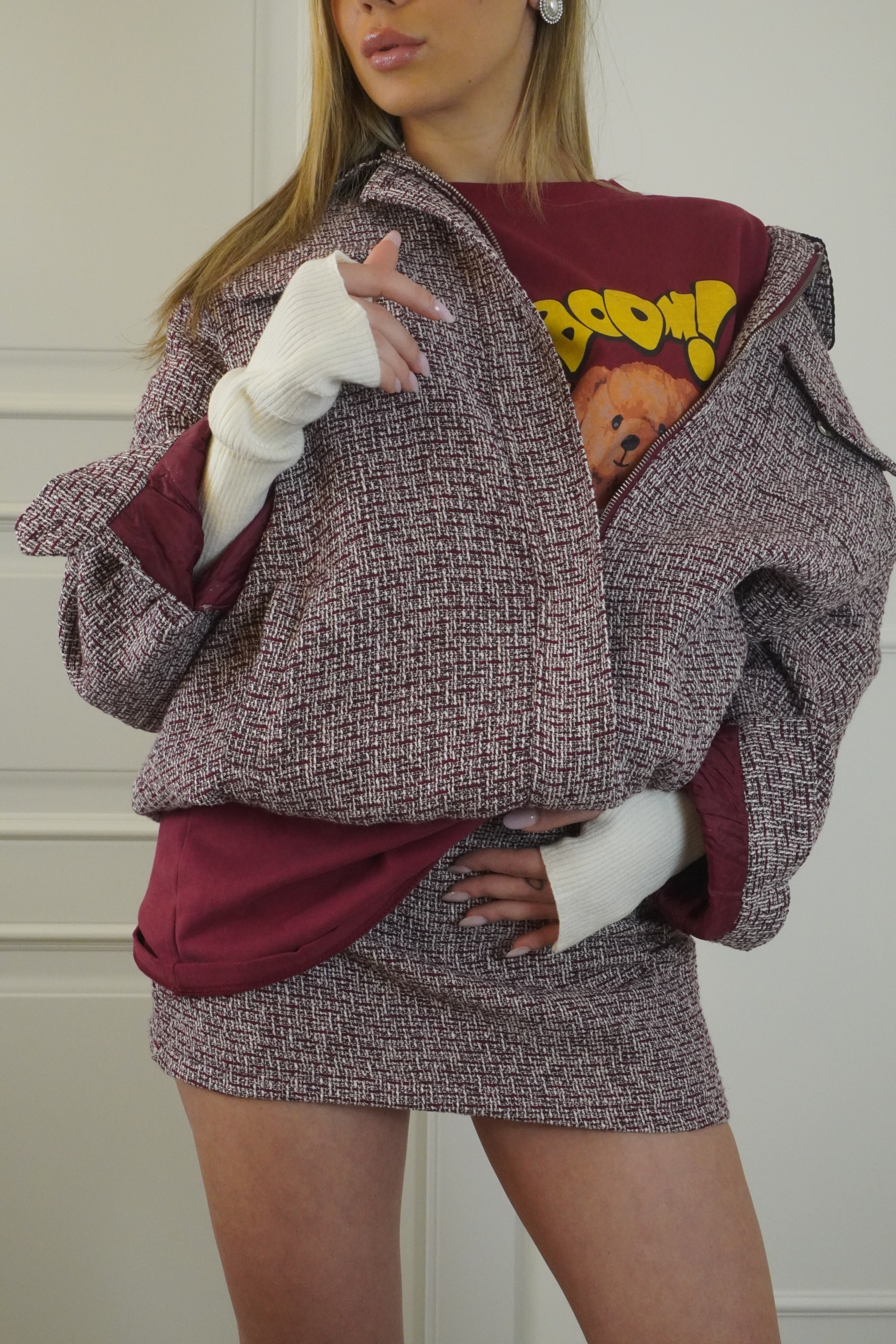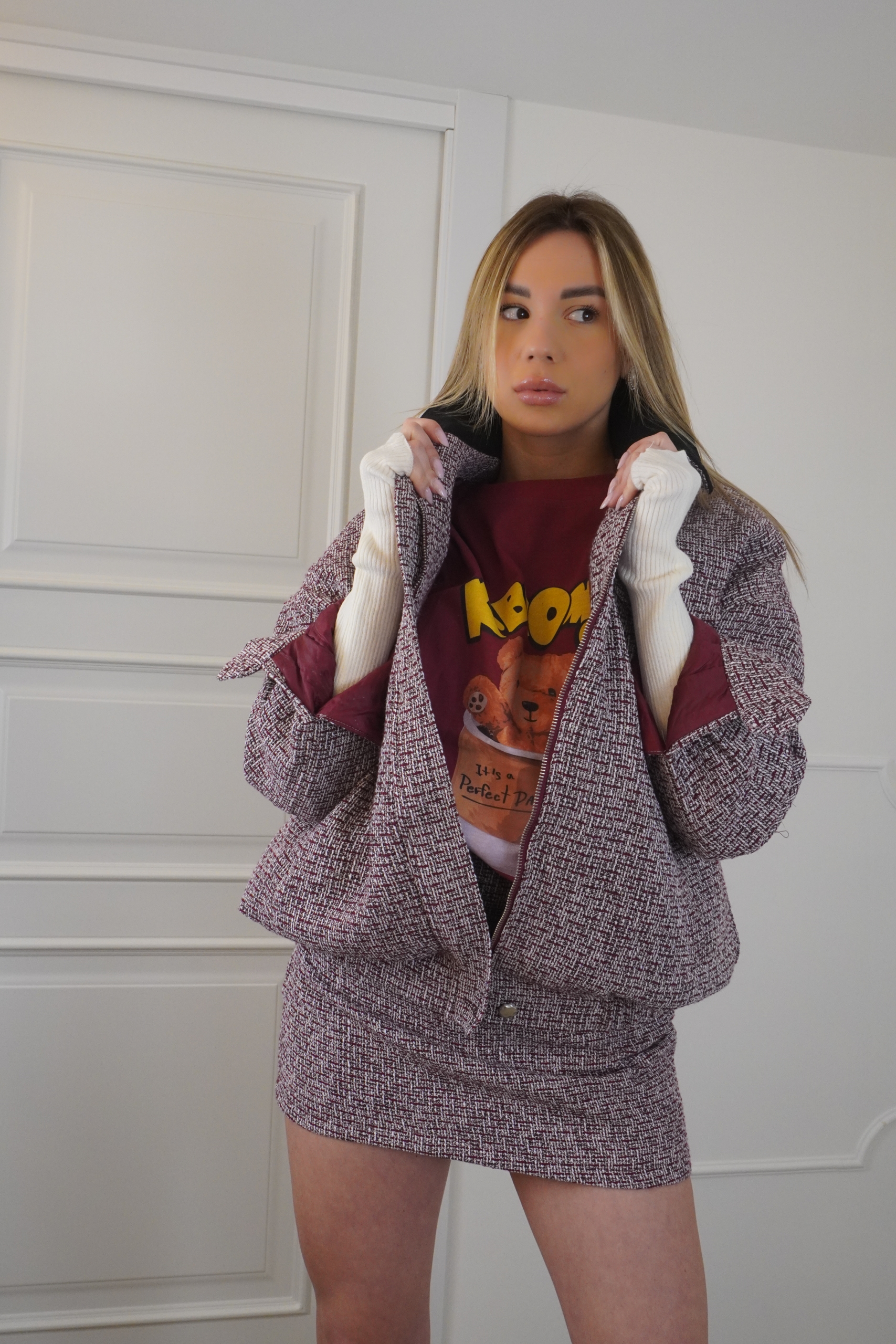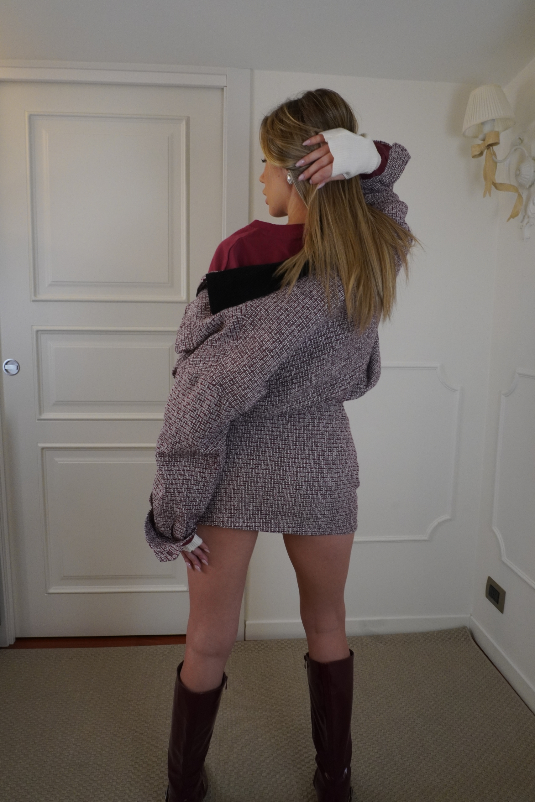 coordinato composto dalla gonna con il pantaloncino, chiusura a zip sul fianco, due finte tasche sul dietro;