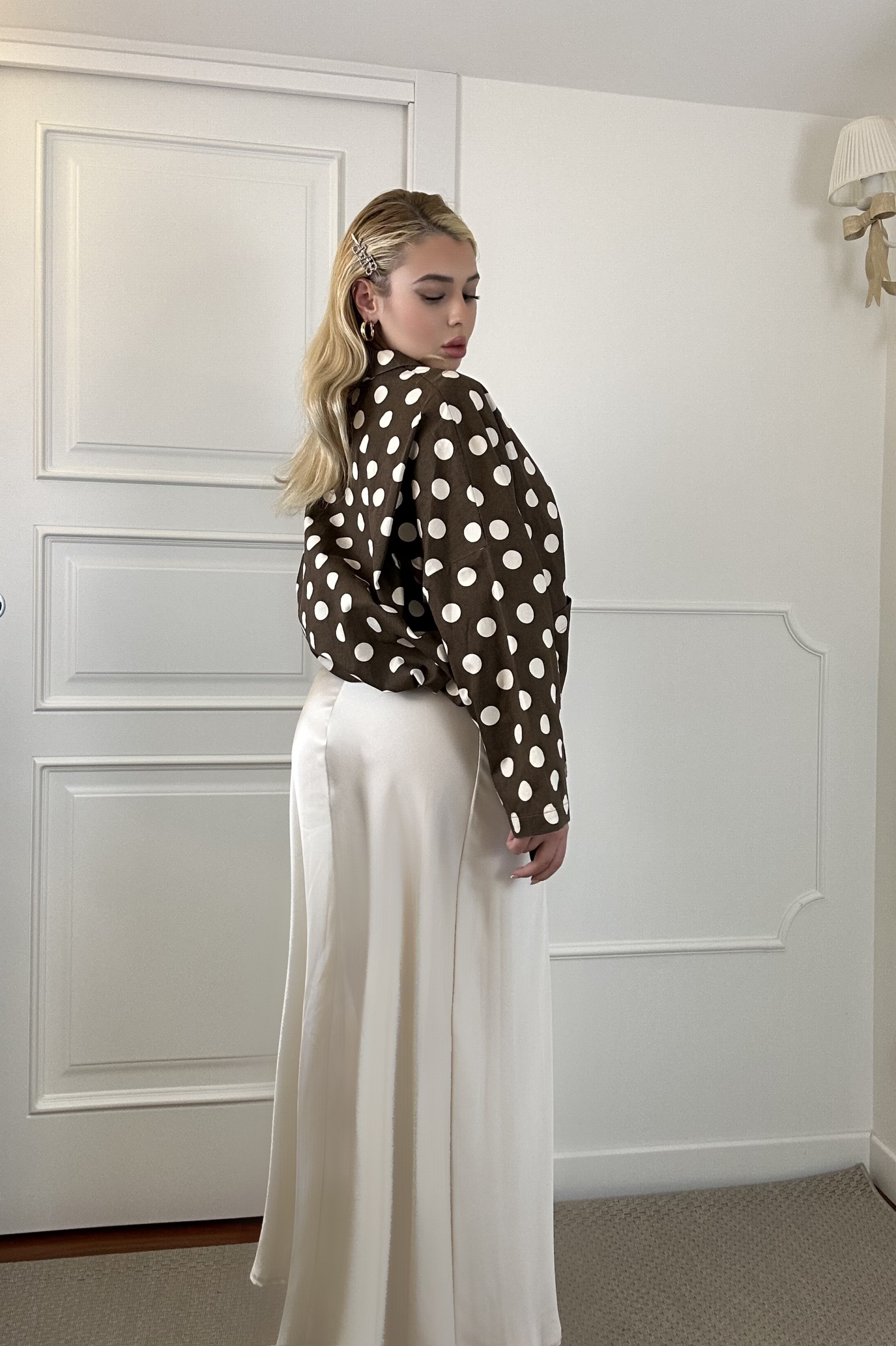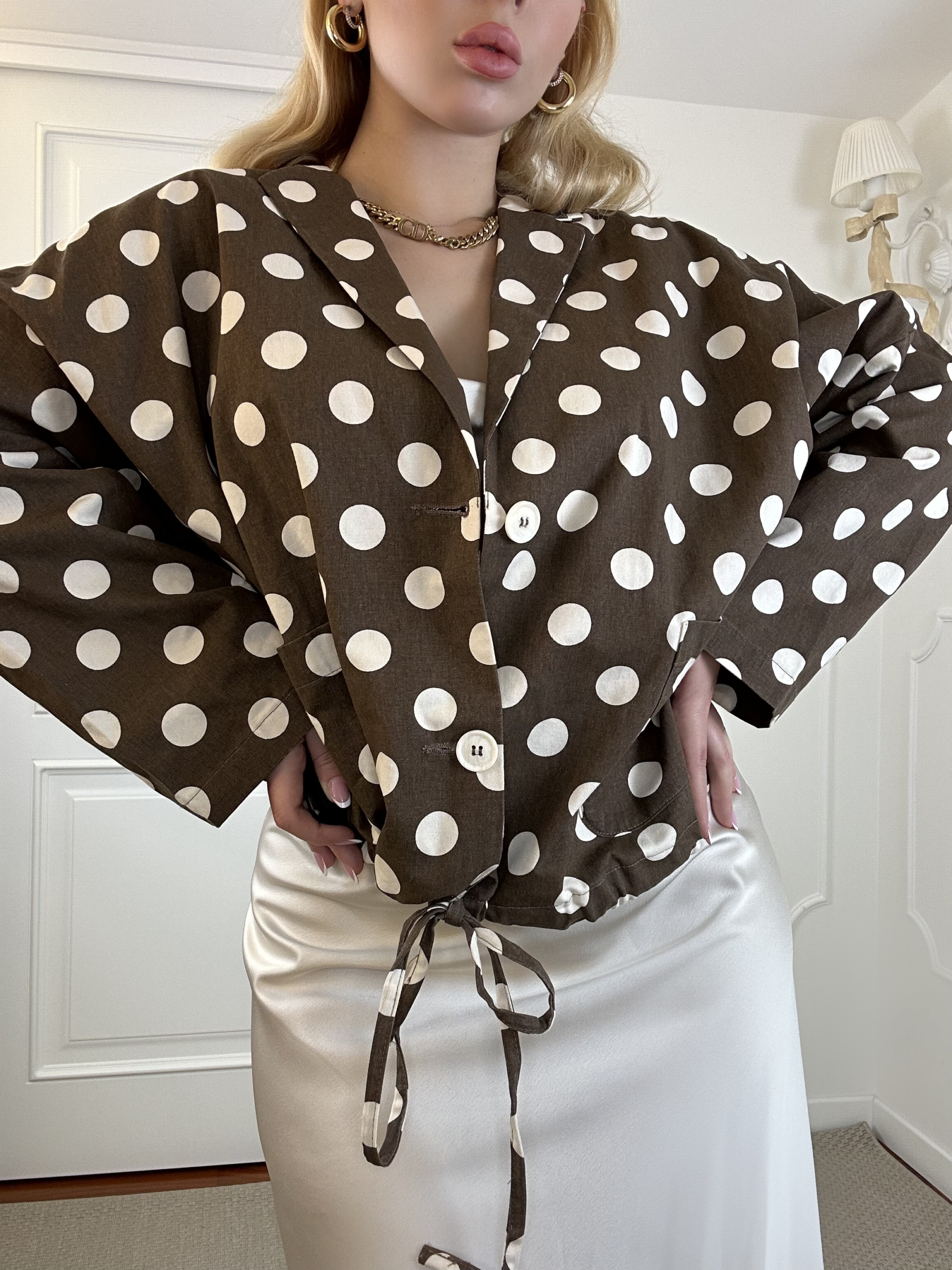 giacca in cotone leggero con stampa a pois, chiusura bottoni sul davanti, coulisse regolabile in vita. Vestibilità over fino ad una XL.