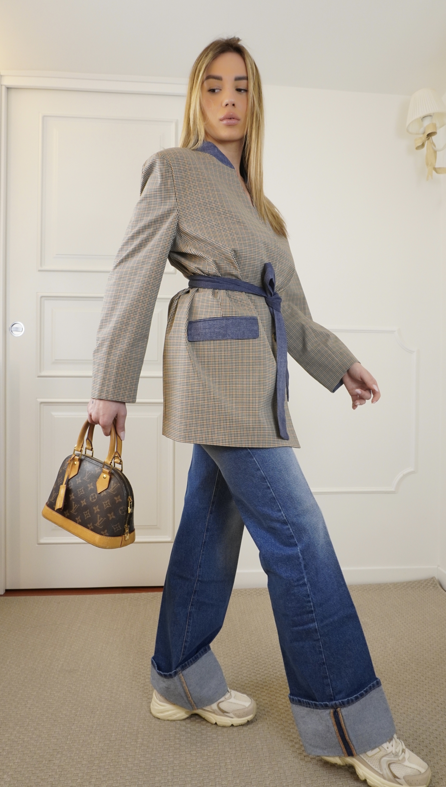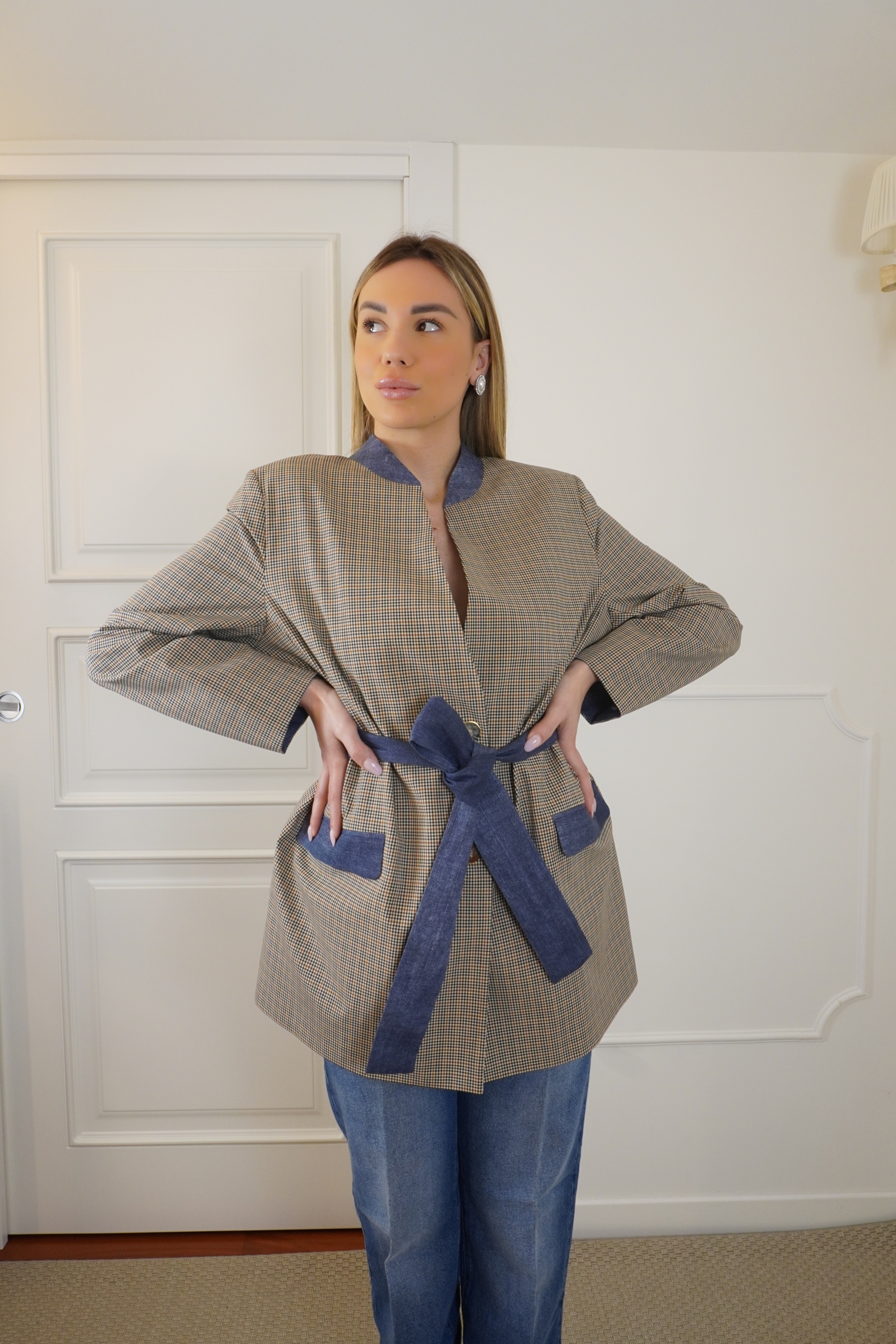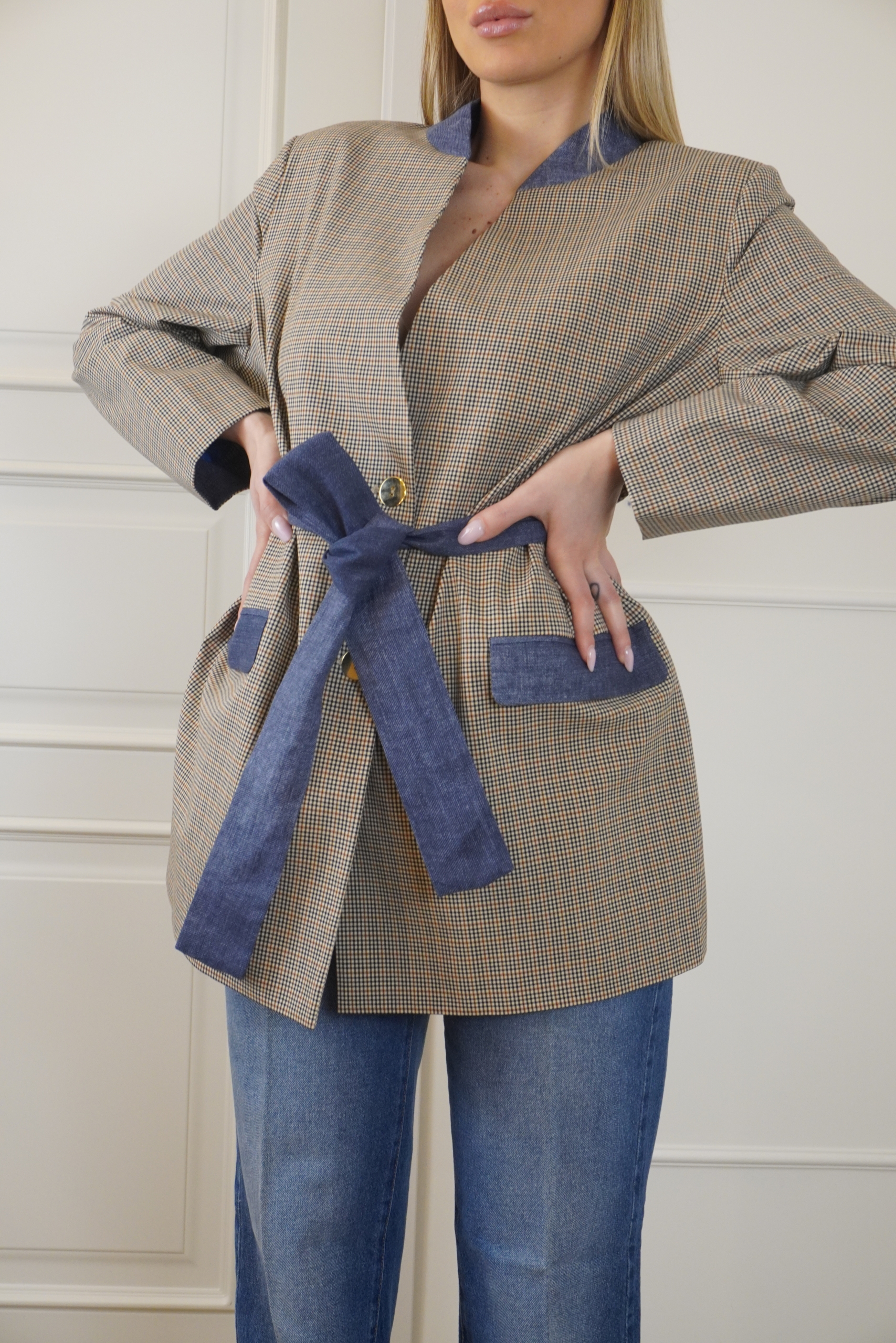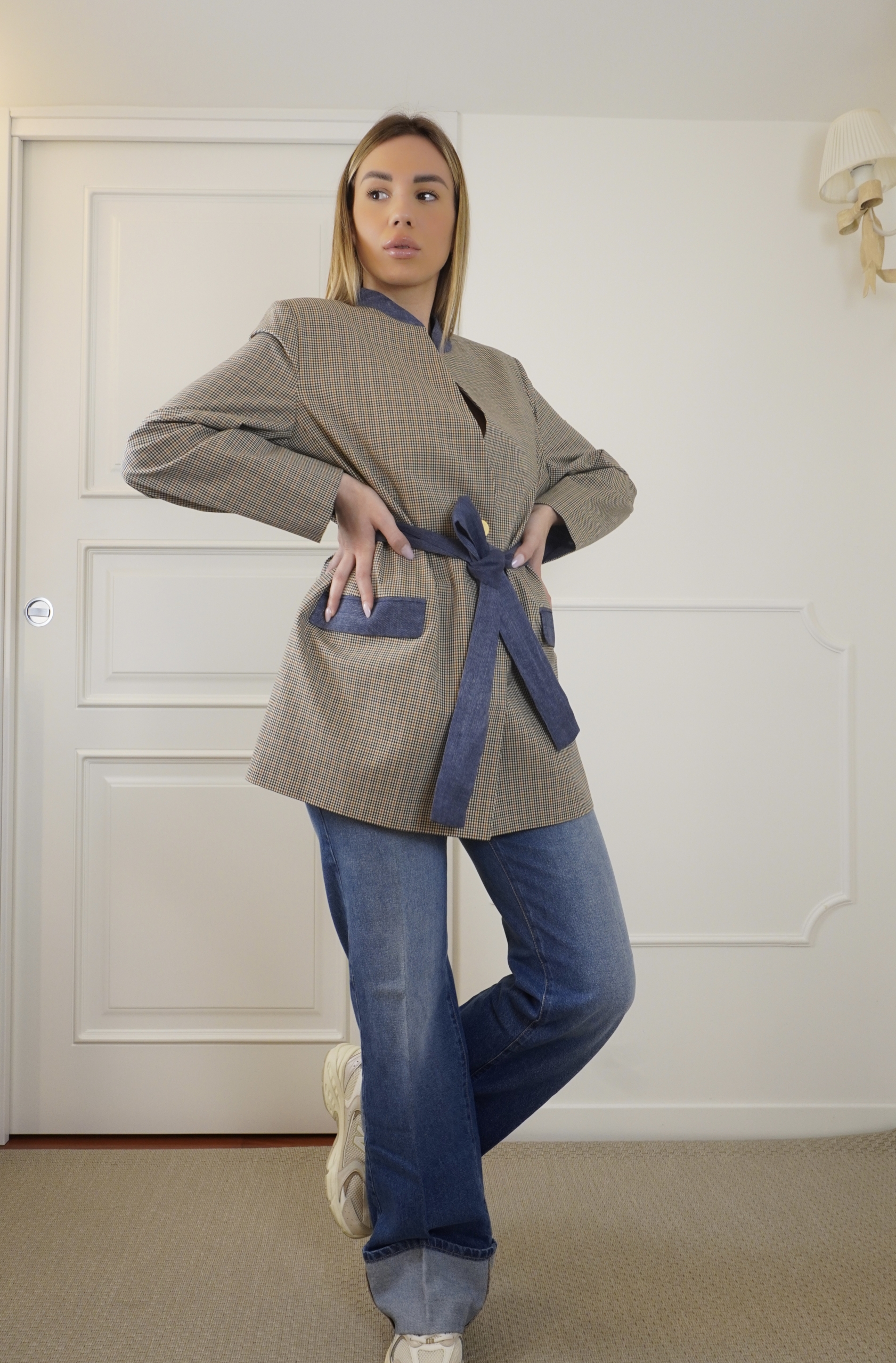 giacca con texture a quadri e dettagli in jeans, collo a giro cintura rimovibile sulla vita, due finte tasche sul dv , chiusura a bottoni frontale. Vestibilitá comoda, la modella indossa una 40