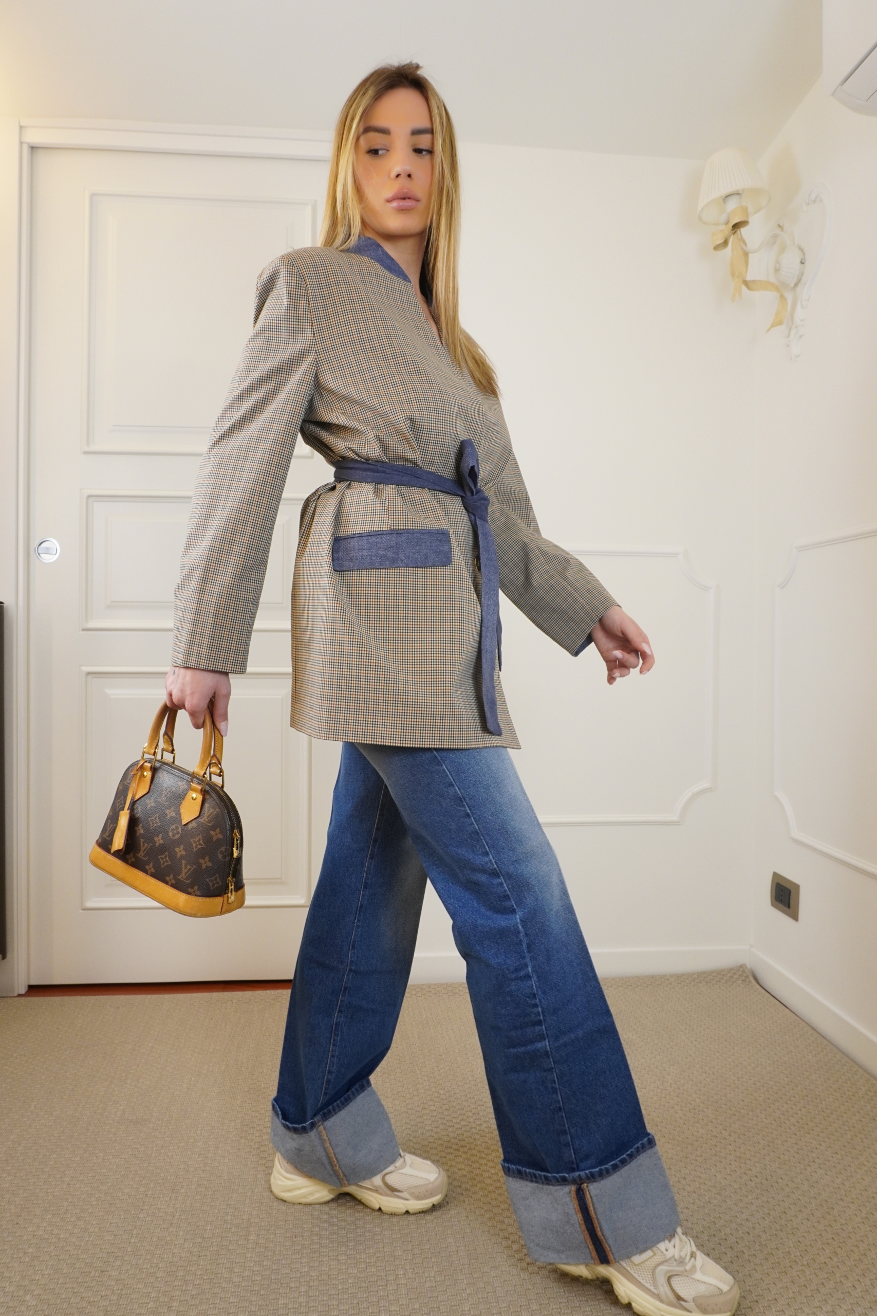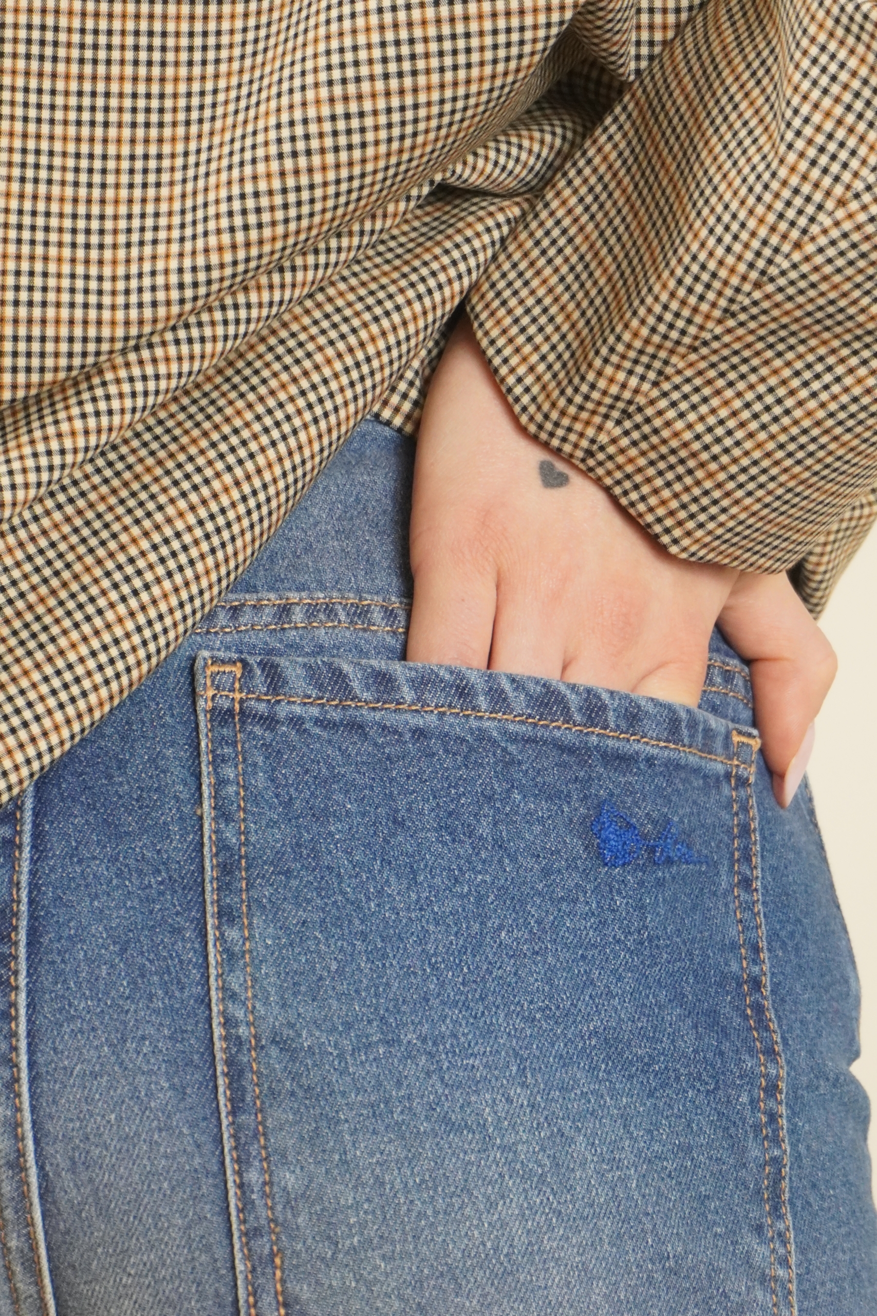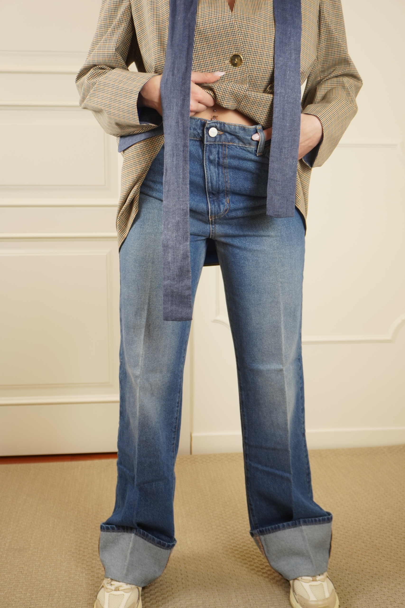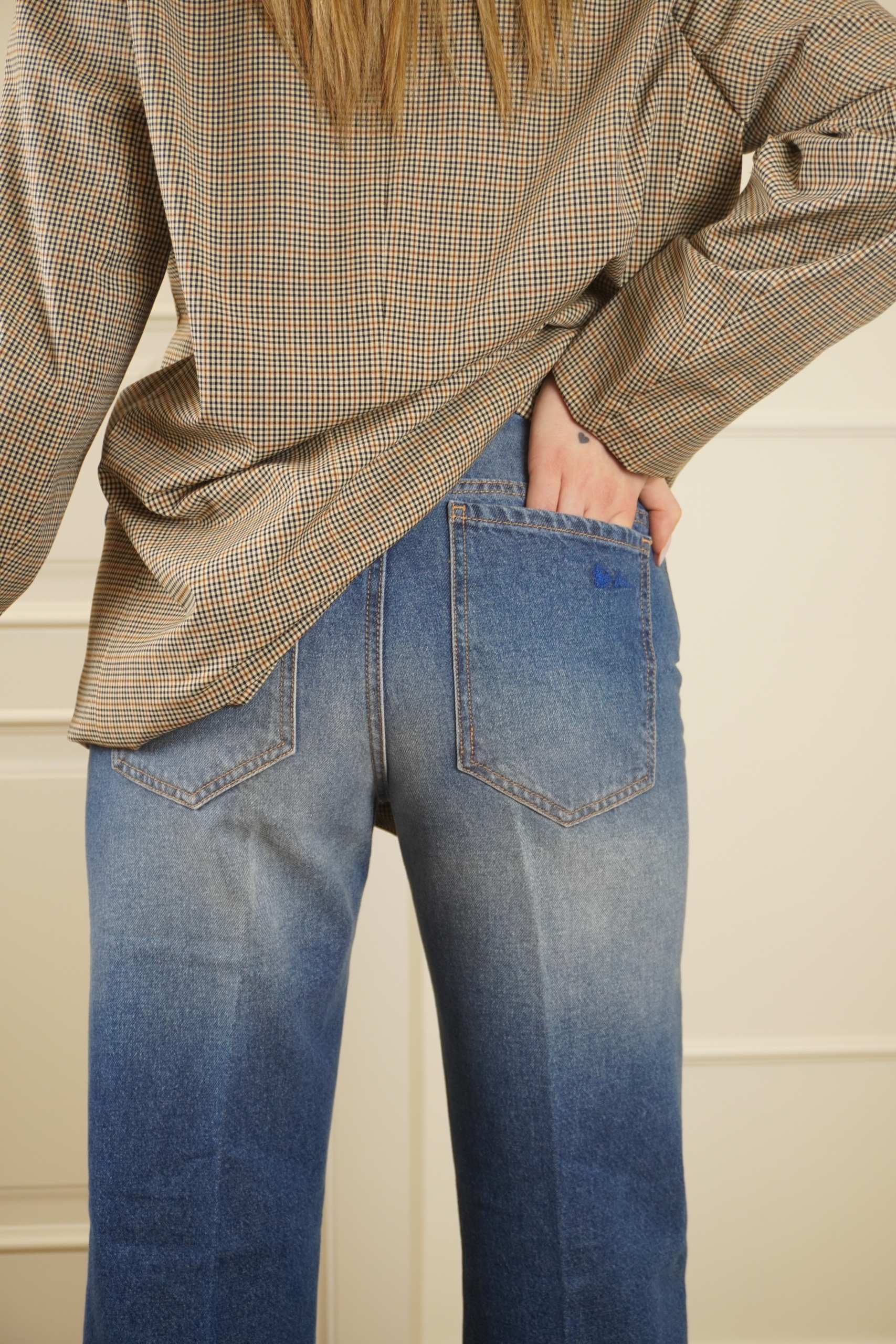 jeans tessuto fermo con vestibilitá comoda, chiusura bottone e zip sul davanti, vita media, 4 tasche totali , dettaglio orlo con risvolto . La modella è una 38 e indossa una 26 .