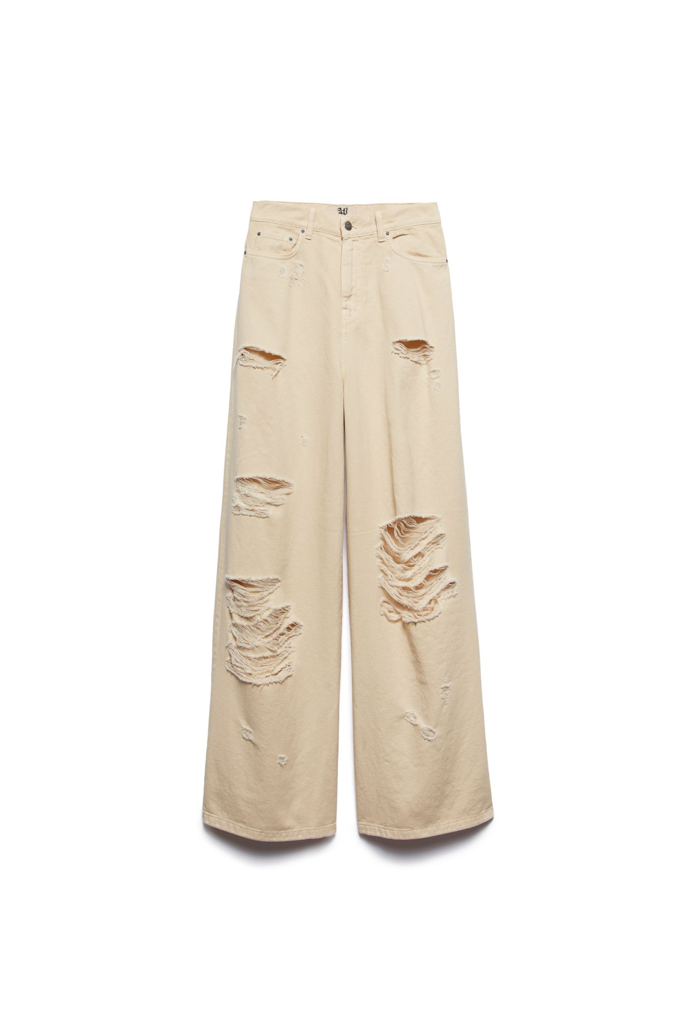 DENIM DI COTONE MODELLO CINQUE TASCHE,DETTAGLI DESTROYED,LOGO RICAMATO SUL RETRO, LABEL LOGATA SUL RETRO,