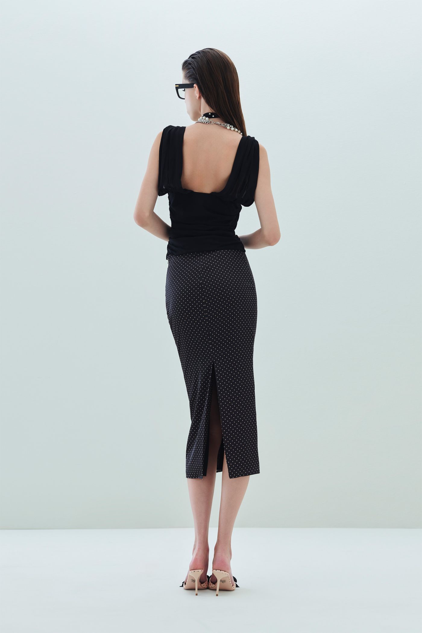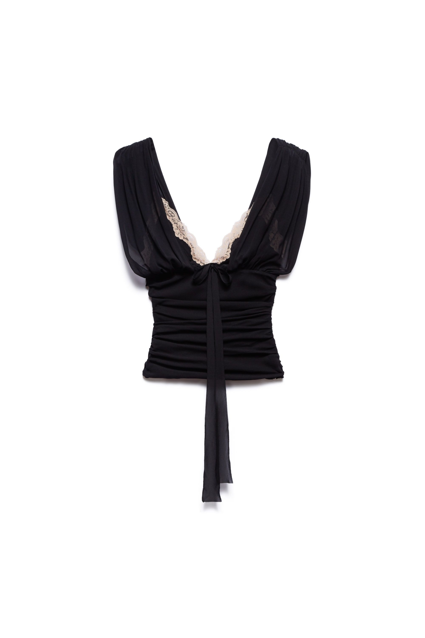 TOP IN VISCOSA, MOTIVO DRAPPEGGIATO, DETTAGLIO IN PIZZO, SCOLLO A V, SPALLINE COMPOSIZIONE: CAPO: 100% VISCOSA PIZZO: 100% POLIAMMIDE