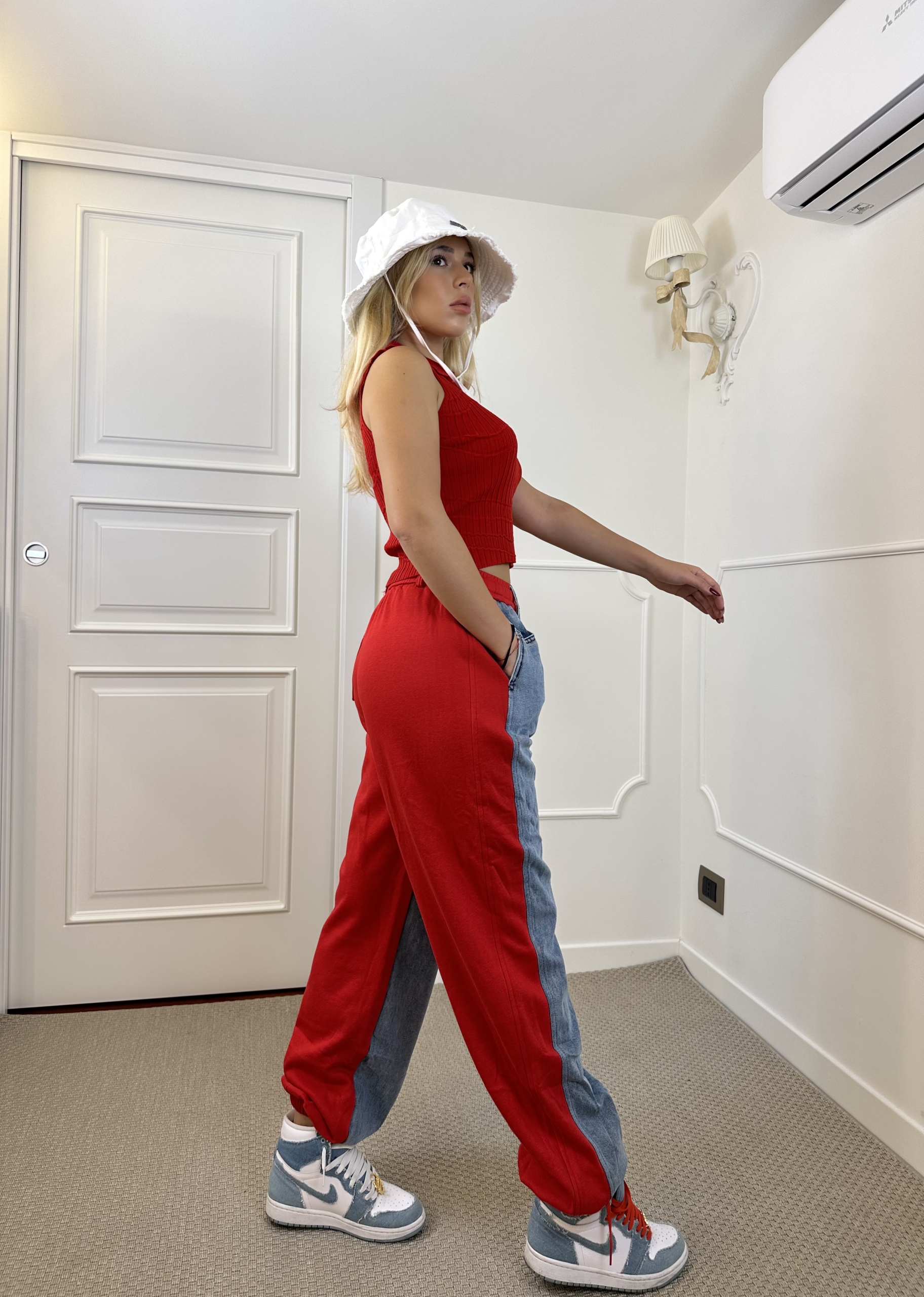 pantatuta con effetto jeans sul davanti Elastico in vita con vestibilità over, 3 tasche totali, passanti per cintura, laccio in vita regolabile. Orlo elasticizzato .