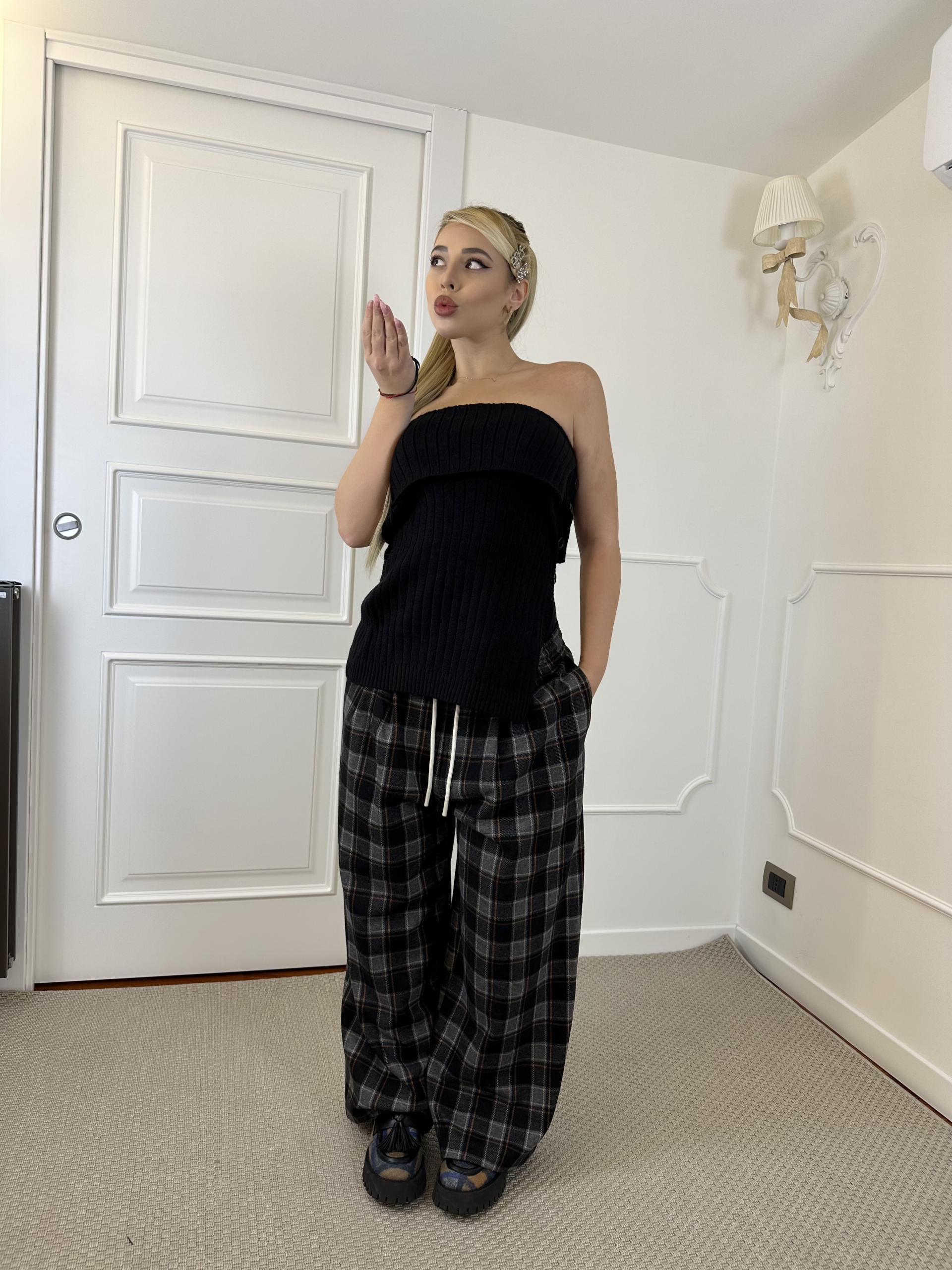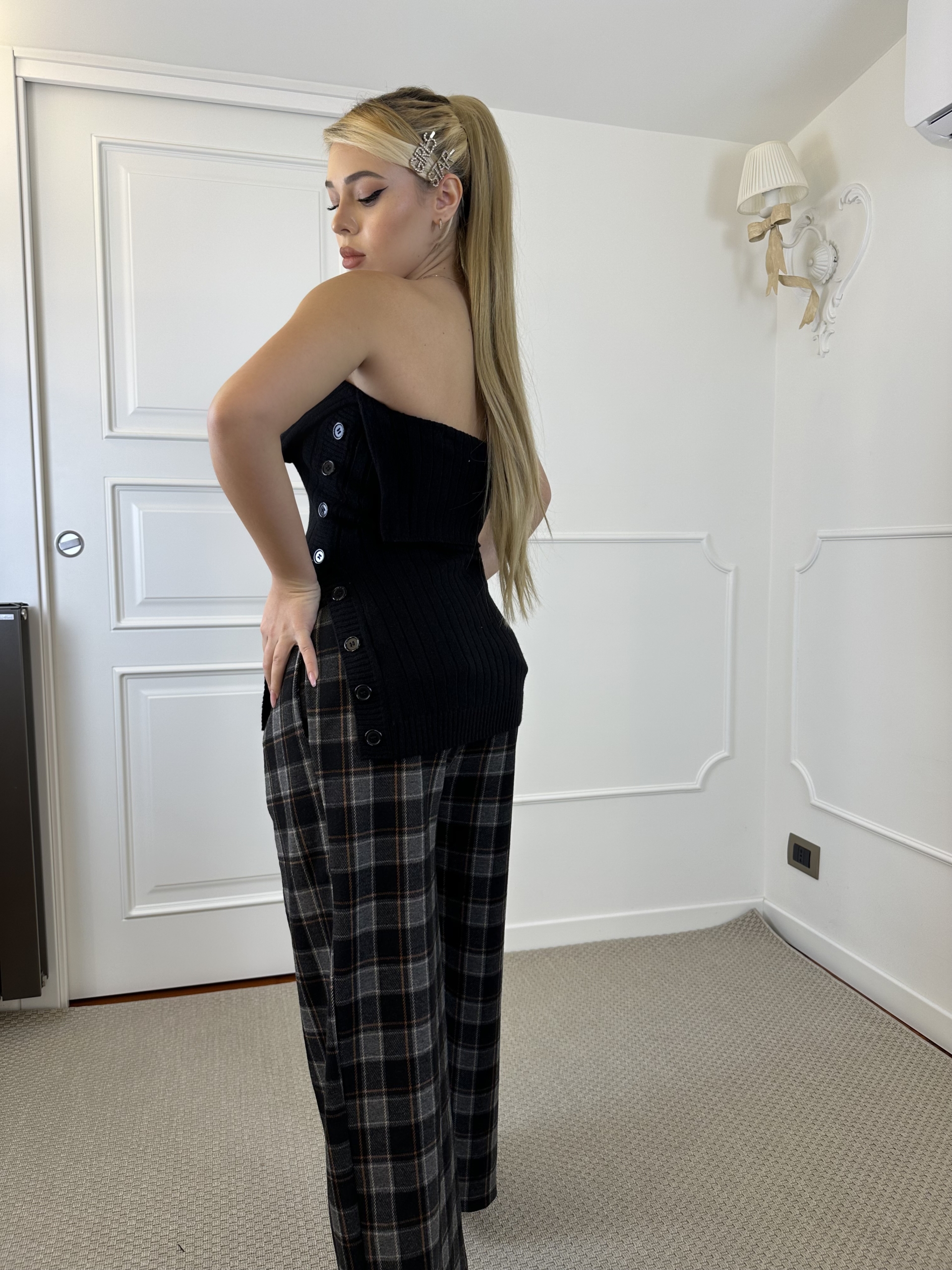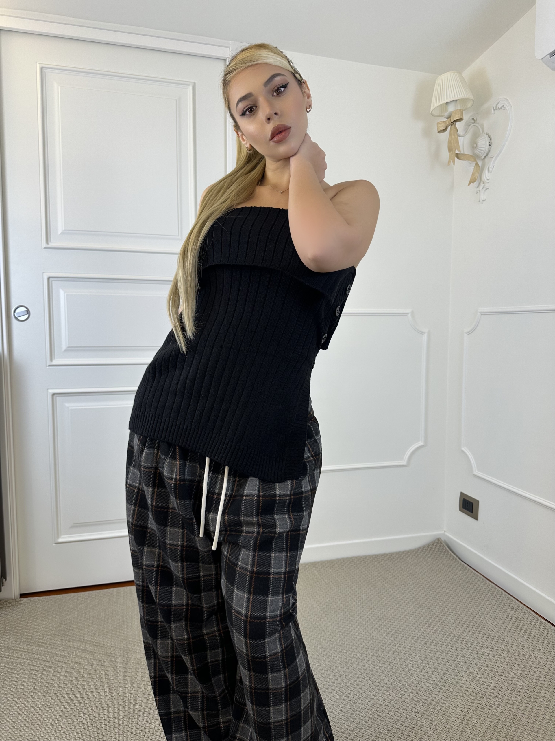 top in lana a coste , scollo dritto senza spalline, elasticizzato può vestire fino ad una L , Chiusura a bottoni sul fianco .