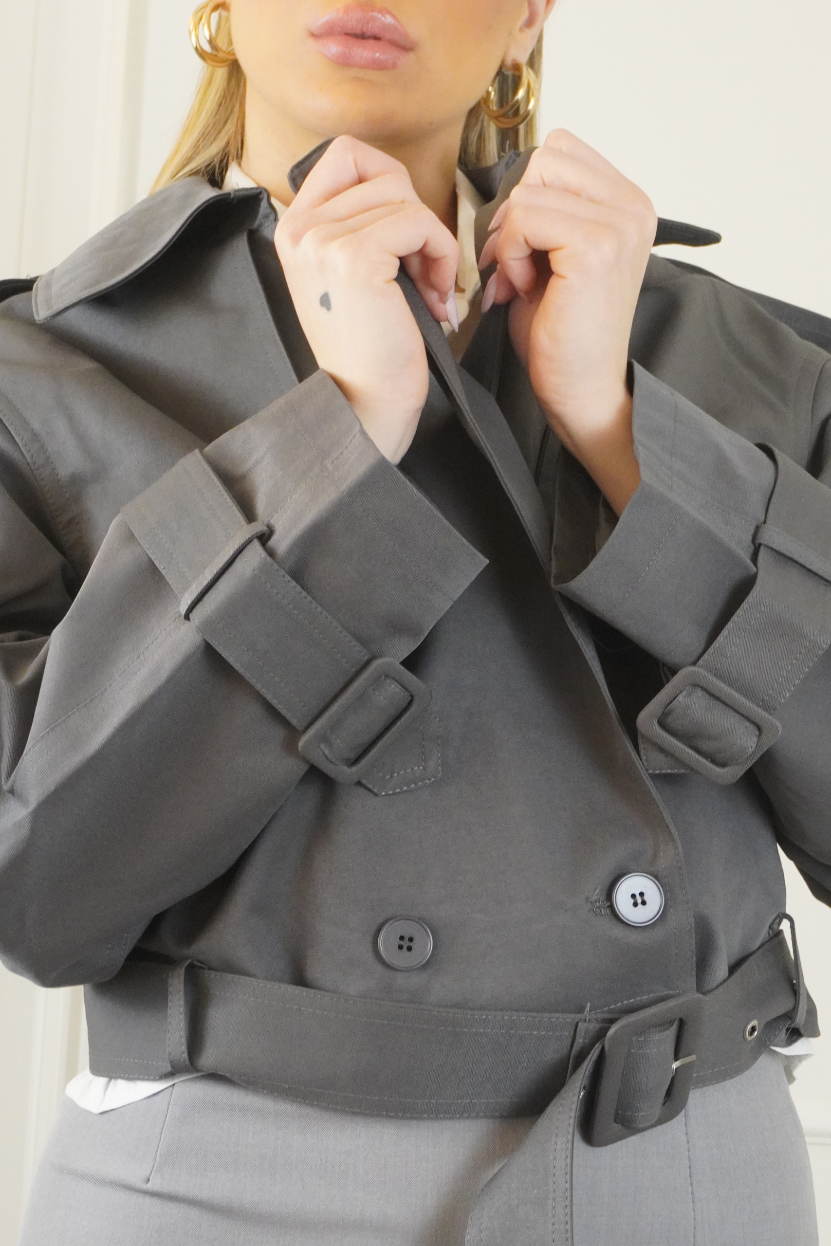 Trench corto, con chiusura a bottoni e cintura regolabile in vita, vestibilitá normale, la modella indossa una S .